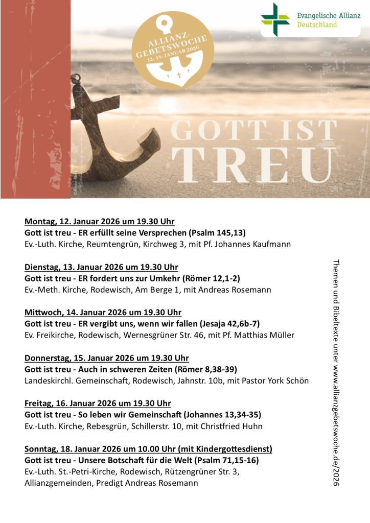 Die Liebe zu Christus, das Vertrauen in Gottes Wort als Maßstab für unser Leben, die Einheit untereinander und der Auftrag, in die Welt zu gehen, eint uns im Gebet. Weil Gott treu ist, lasst uns während der Allianzgebetswoche treu für Menschen beten. Gott ist treu – das ist unser Glaube, unsere Stärke und unser Auftrag.
