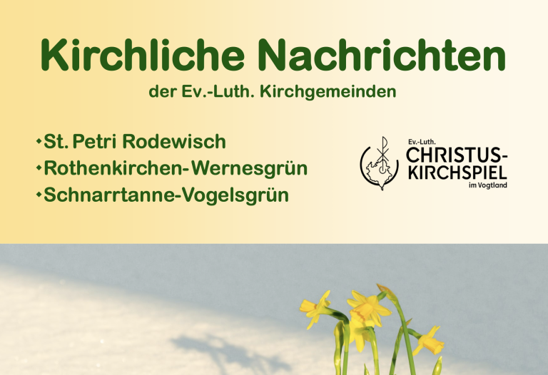 Seit Februar 2026 halten Sie mit dem Gemeindebrief etwas Neues in den Händen und doch zugleich auch etwas sehr Vertrautes: kirchliche Nachrichten aus unserer Region, Einladungen zu Gottesdiensten und Veranstaltungen, Berichte von gemeinsamen Wegen im Glauben und vieles mehr, was unser kirchliches Leben lebendig macht und uns miteinander verbindet. Und dennoch ist diese Ausgabe ein besonderer Anfang, weil sie in einer neuen Form erscheint, in der wir künftig als Gemeinden im Kirchspiel stärker zusammenrücken möchten. Aus der Zusammenarbeit der drei Kirchgemeinden Rodewisch, Rothenkirchen-Wernesgrün und Schnarrtanne-Vogelsgrün kann hoffentlich in Zukunft ein noch bewussteres Miteinander werden. Der neue Gemeindebrief soll diesen Prozess unterstützen und die Chance eröffnen, voneinander zu wissen, füreinander da zu sein und das reiche Gemeindeleben, das sich an mehreren Orten vollzieht, gegenseitig wahrzunehmen und zu stärken.